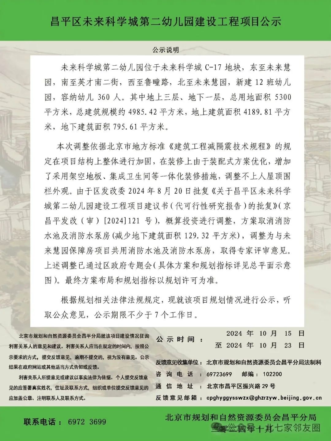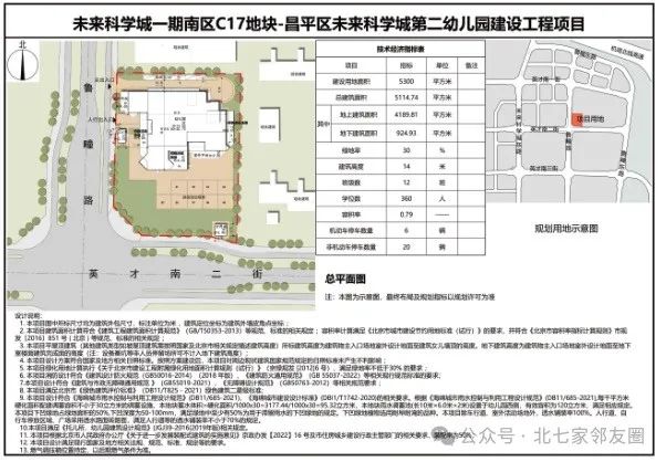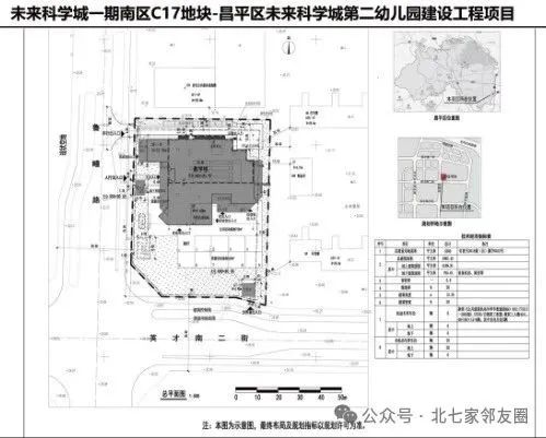 未来科学城第二幼儿园位于未来科学城C-17地块,东至未来慧园,南至英才南二街,西至鲁疃路,北至未来慧园,新建 12班幼儿园,容纳幼儿 360 人。其中地上三层、地下一层,总用地面积 5300平方米,总建筑规模约 4985.42 平方米,地上建筑面积 4189.81 平方米,地下建筑面积795.61 平方米。本次调整依据北京市地方标准 《建筑工程减隔震技术规程》的规定在项目结构上整体进行加固,在装修上由于装配式方案优化,增加了采用架空地板、集成卫生间等一体化装修措施,调整不上人屋顶围栏外观。由于区发改委 2024年8月20日批复《关于昌平区末来科学城第二幼儿园建设工程项目建议书(代可行性研究报告)的批复》(京昌平发改(审)120241121号),概算投资进行调整,方案取消消防水池及消防水泵房(减少地下建筑面积 129.32 平方米),调整为与未来慧园保障房项目共用消防水池及消防水泵房,取得专家评审意见。上述调整已通过区政府专题会(具体方案和规划指标详见总平面示意图)。最终方案布局和规划指标以规划许可为准。根据规划相关法律法规规定,现就该项目规划情况进行公示,听取公众意见,公示期限不少于7个工作日。