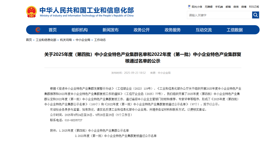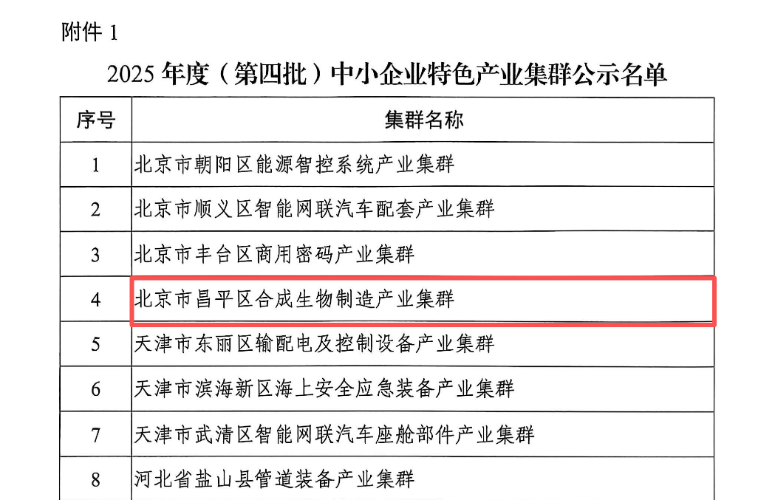 近日,工业和信息化部中小企业局公示了2025年度(第四批)中小企业特色产业集群名单,北京市昌平区合成生物制造产业集群成功入选,成为全国首个获评国家级中小企业特色产业集群的合成生物制造类产业集群。