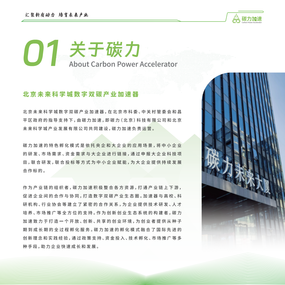 碳力加速是在昌平区政府的指导和支持下,由未来科学城集团下属产业发展公司联合碳力(北京)科技有限公司共同打造的全体系创新孵化平台,于2023年正式启动运营。