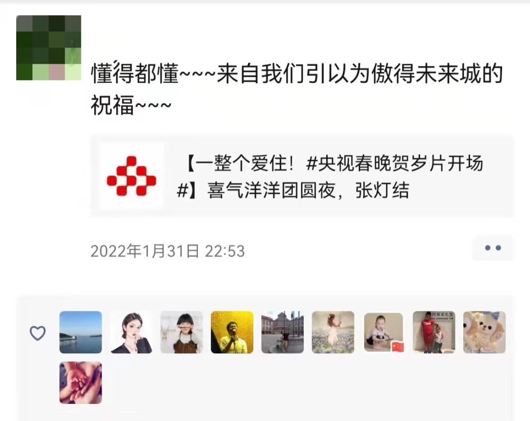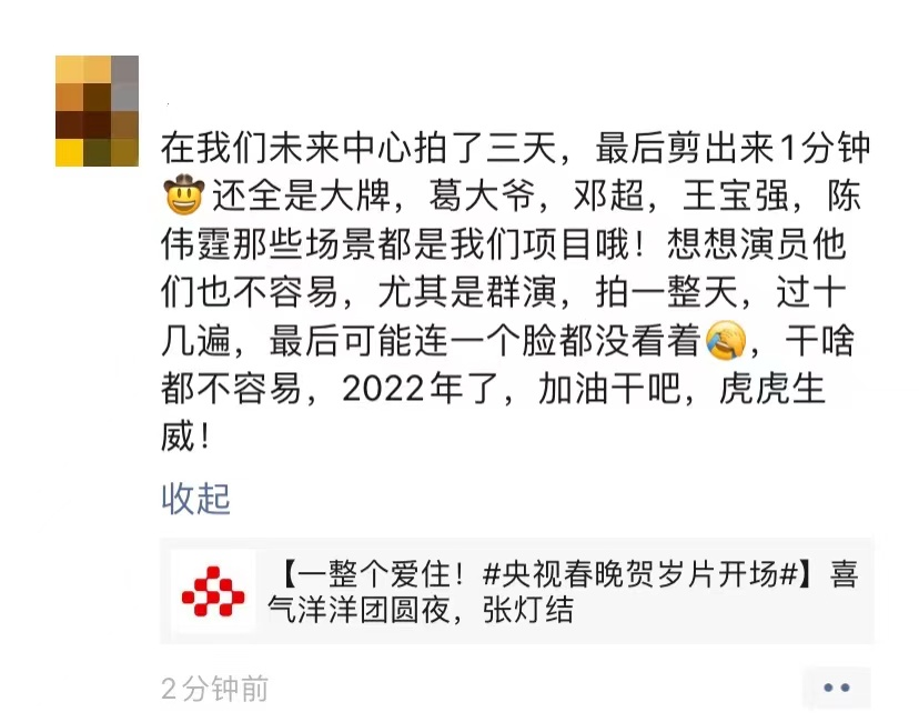 值得一提的是,作为央视春晚亲历者,如此值得骄傲的事情大家只能在心底雀跃,等待着春晚的开播。很多未来科学城人戴着“寻视镜”看了今年春晚,“虎年共赴未来”“只用一秒就能认出你”“懂的都懂”“未来已来”......同事们的朋友圈文案满满都是对工作的热爱和身为未来科学城人的自豪。