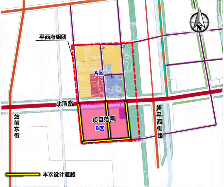 平西府土地一级开发项目包含四条道路,北至北清路,南至平西府南路,规划为城市支路,分别为平西府东路、平西府中路、平西府西路、平西府南路,道路总长1095.60米,红线宽20-25米,实施内容包括雨水、污水、给水、再生水、电力、电信、燃气等管线及道路、绿化、交通、照明等附属设施。