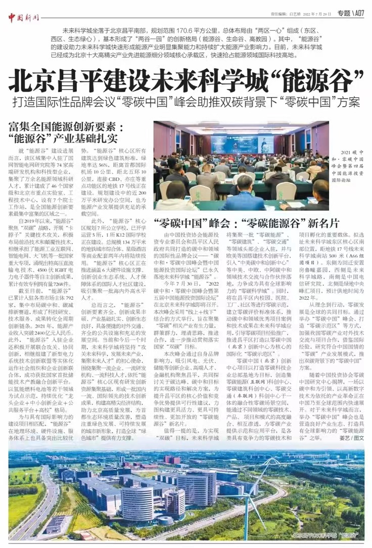7月30日,2022碳中和·零碳中国峰会暨第五届中国能源投资国际论坛在未来科学城“能源谷”举办。此次论坛由生态环境部应对气候变化司、国家能源局新能源和可再生能源司指导,中国投资协会能源投资专委会与昌平区人民政府联合主办,未来科学城管委会、昌平区投资促进服务中心、美国国家可持续发展中心(NCSD)、尼尔·布什全球顾问有限责任公司协办,北京未来科学城发展集团有限公司旗下北京未来科学城产业发展有限公司、微能云(北京)科技有限公司承办。
