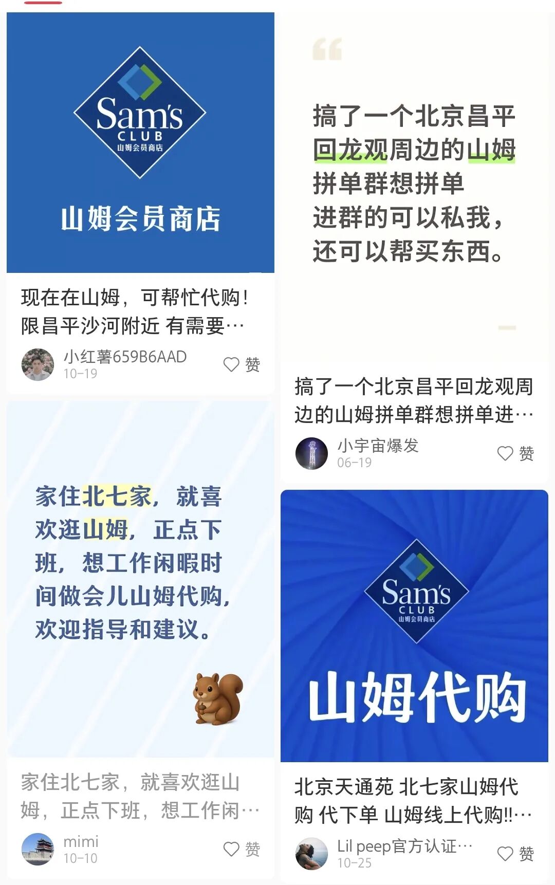 此外,昌平区山姆还吸引了大批代购的关注。早在10月,已有账号发文称家住北七家,可做昌平山姆代购。开业时间官宣后不久,就有代购发布优惠信息并组建群聊,吸引消费者进群。关于代购价格,有代购称收总额5%的手续费,有的代购则称每单收费5-10元。