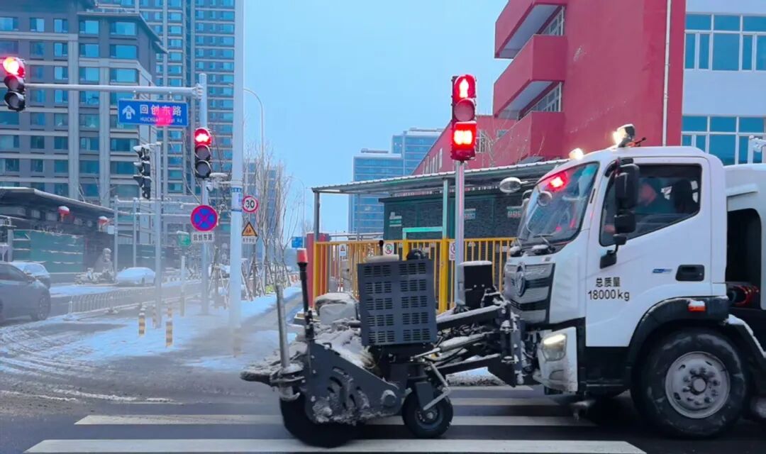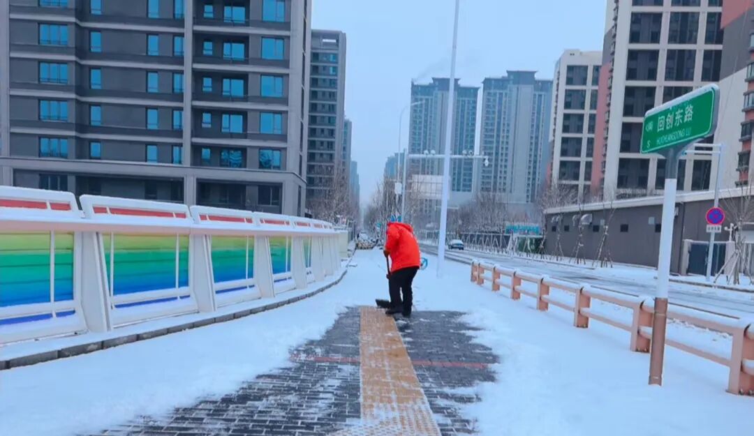 在主干道、桥梁等易结冰重点区域,采用除雪车滚刷扫雪,精准、适量撒布融雪剂的方式,重点防范低温结冰隐患;在人行道等大型机械无法进入的区域,组织人工突击队,使用雪铲、人工推雪机、扫帚清理积雪,防范积雪堆积影响出行。