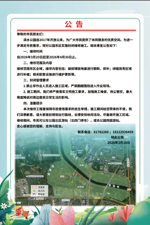为进一步提升公园环境品质,更好地满足市民休闲健身需求,滨水公园东区将于2026年3月20日至2026年4月30日实施封闭维修。本次维修范围为东区全域,维修期间,东区将实行全封闭管理,严禁非作业人员进入施工区域,具体情况详见下方公告。